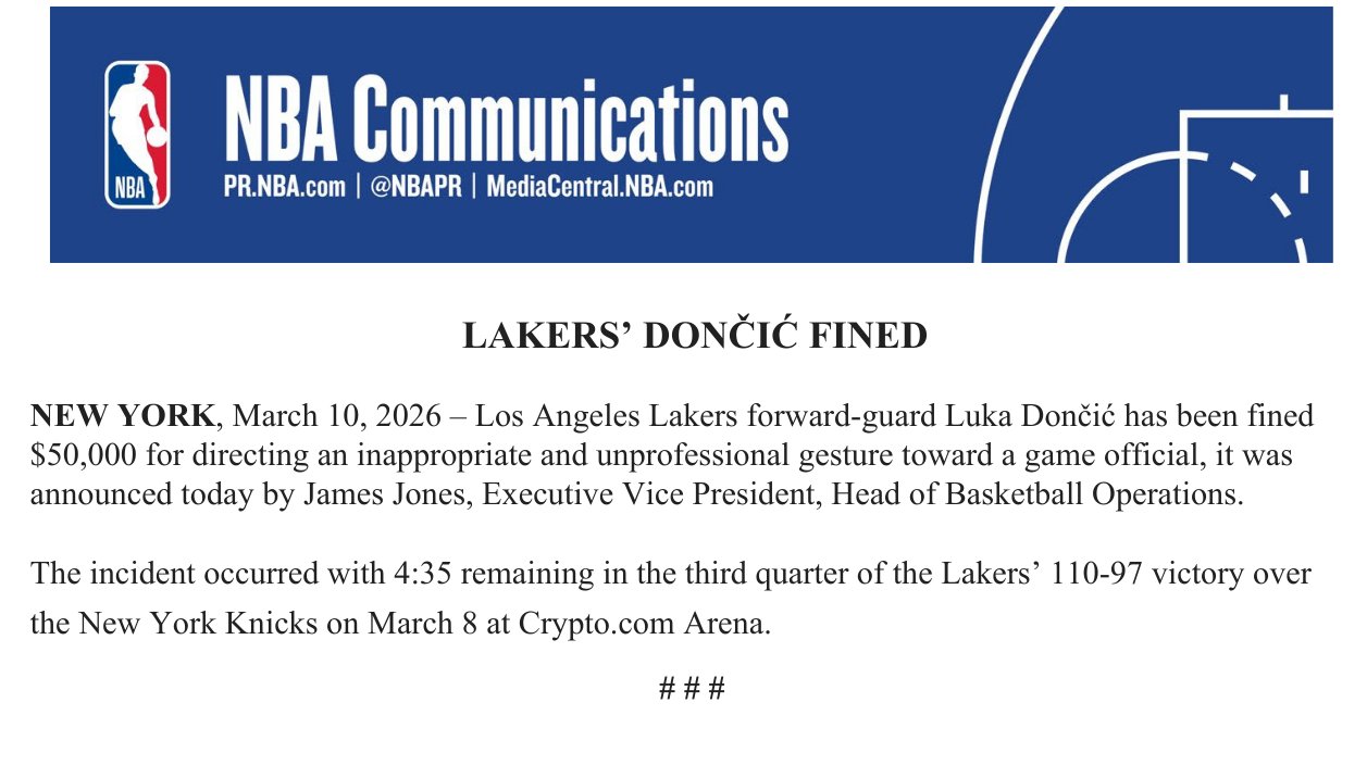 La NBA procurando el respeto y la disciplina, multó a la estrella de los Ángeles Lakers, Luka Dončić, por faltarle el respeto a un árbitro en el juego que su equipo disputó anoche contra los New York Knicks en el Crypto.com Arena, en Los Ángeles, así lo comunicó James Jones, Vicepresidente Ejecutivo y Jefe de Operaciones de Baloncesto de la NBA.