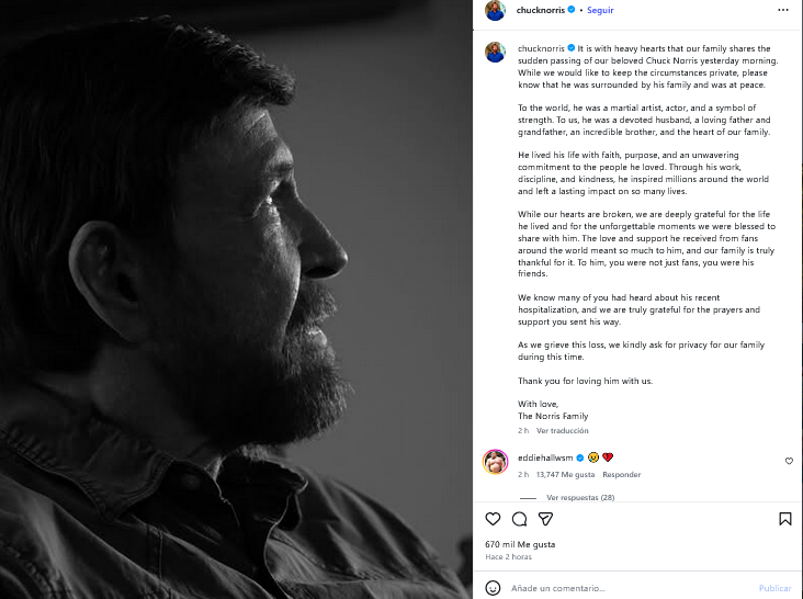 “Con profunda tristeza, nuestra familia comunica el repentino fallecimiento de nuestro querido Chuck Norris ayer por la mañana. Si bien preferimos mantener la privacidad en torno a las circunstancias, les informamos que estuvo rodeado de su familia y que descansa en paz”, reza el comunicado.
