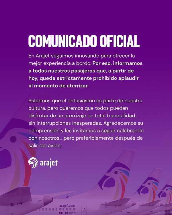 Arajet la aerolínea de bajo costo con sede en Santo Domingo, República Dominicana, emitió un comunicado en sus redes sociales dando a conocer como nueva disposición que, durante el aterrizaje de sus aeronaves, las personas deben abstenerse de aplaudir.